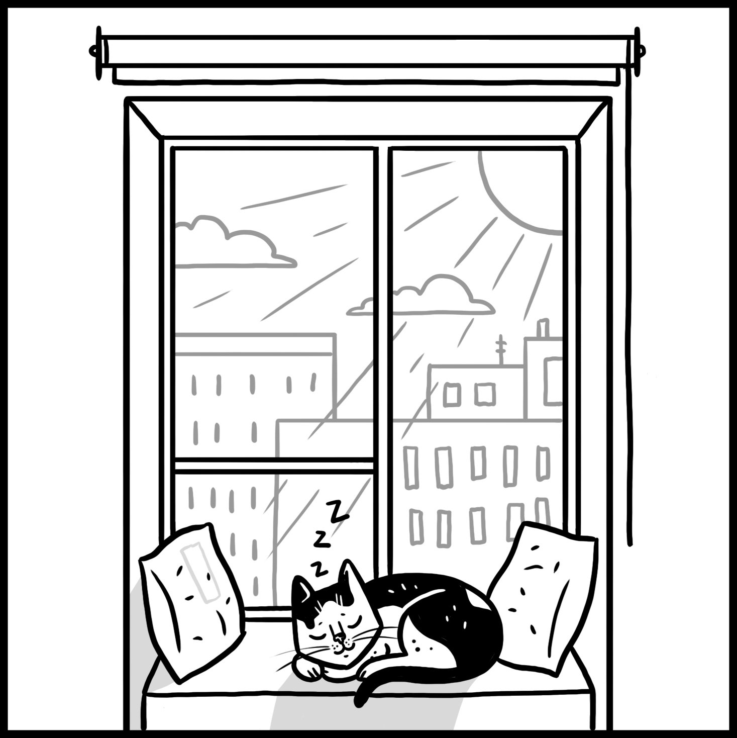 So we had ourselves a cat comic and me playing around with a cute yet unreliable narrator of an interior existence—a cartoonish camera angle on my experience as a first-time cat owner.